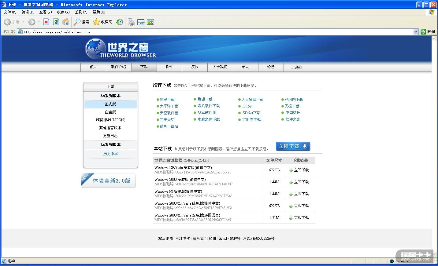 2.4Final_2.4.1.5 来源:http://www.ioage.com/cn/download.htmhttp://download.theworld.cn/theworld/TheWorld2.4Final_2.4.1.5_chs.zip瑞星全功能版本: