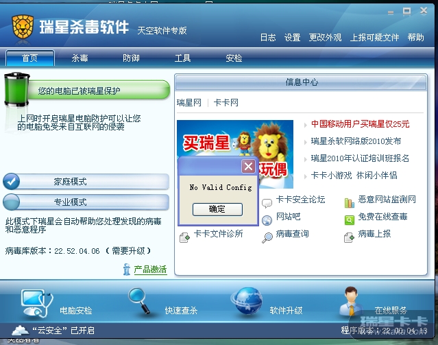我用的“瑞星杀毒软件”是购买的正版,已经用了10个多月了,这以前一直很正常,无论杀毒还是升级都很正常。