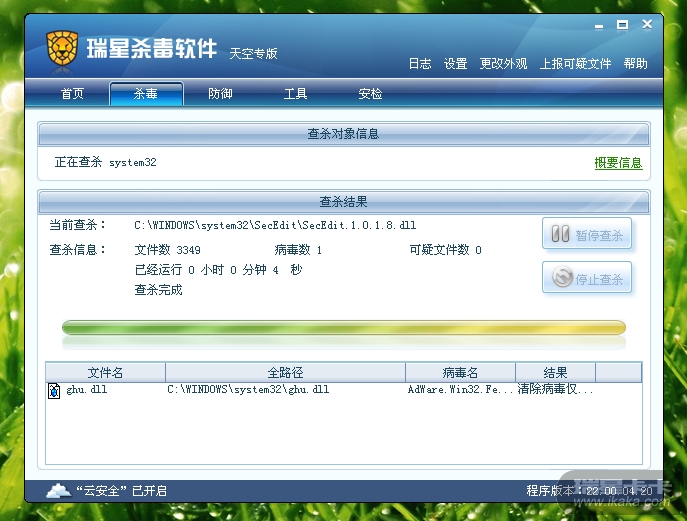 大家好,我在杀毒的时候瑞星查到一个病毒,提示说清除病毒仅需重启,可我重启了N次还是无用。求助高手解决,我上一张图吧。