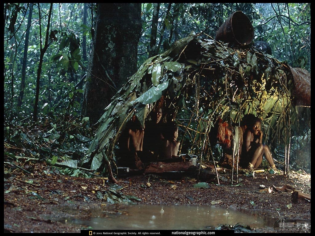 “聪明的融入森林,一个卑格米家庭在树枝搭成的棚子里避雨。”