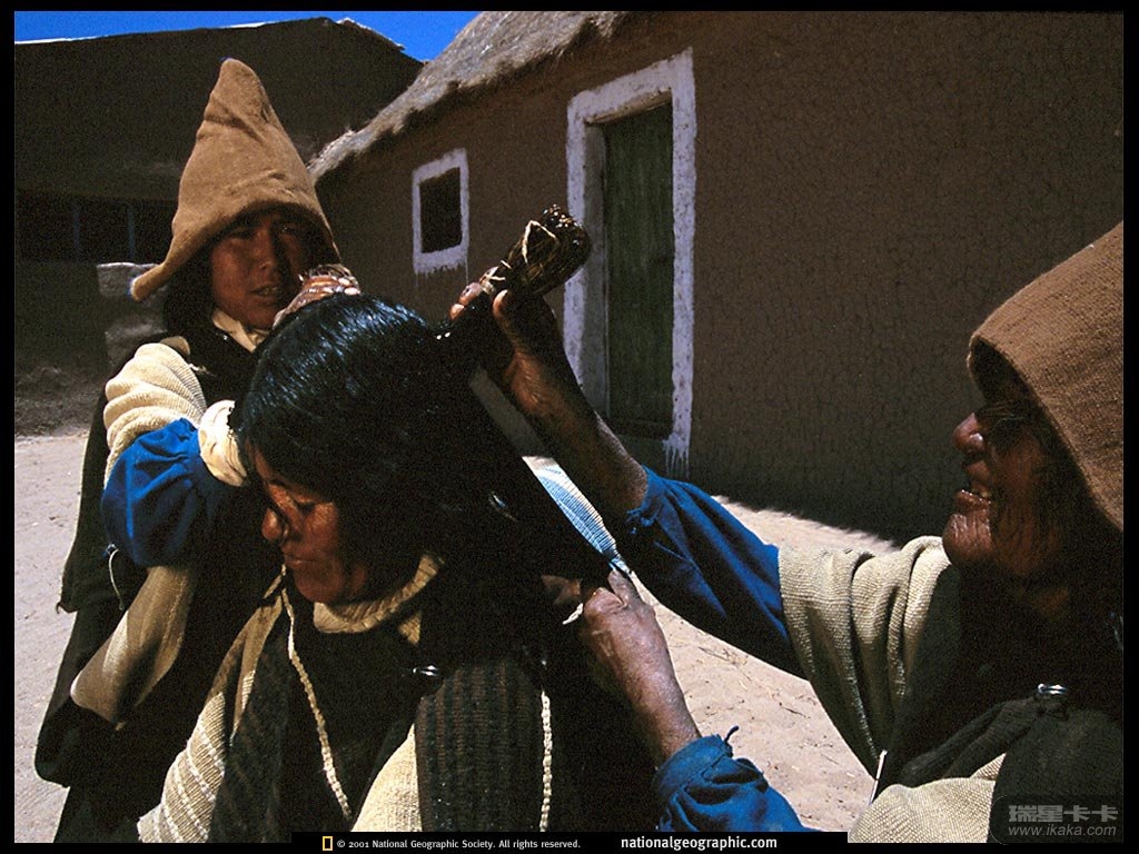 支帕亚妇女帮他人编头发,灵活的手指显示出世代相传的技巧。完成时,她头顶上百条丝带一般细细的发辫如同她的祖先,现代的秘鲁印加人。任凭干旱,寒冷和城市生活的诱惑,两千多支帕亚人仍然厮守着他们的高原故土。“