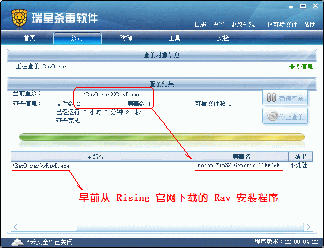 帮助没有完整安装包的用户联机安装当时的 Rav 最新产品,而且此文件已被 Rav2010 更早版本扫描过且未提示为病毒。