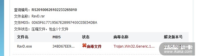 病毒4 在第二帖提供不失多样性的扫描结果!尽管我们不知道 RavD.exe 这个来自 Rising 的产品安装助手程序为什么会被包括 Rav2010 在内的诸多反病毒系统判定为病毒(疑似合作厂商交换病毒特征码所致),但作为 Rising 的老用户,看到 Rising 的产品被其它反病毒产品 “群口铄金” 还是觉得很没面子,希望 Rising 能就 RavD.exe 文件被 Rav2010 等误判为病毒问题尽快修订有关病毒库。
