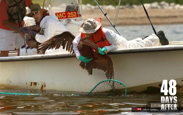 6月7日,专门拯救鸟类的工作人员展开行动,在路易斯安那州捕捉那些被油污覆盖全身的鹈鹕,然后统一送到动物救助中心清洗。由于浮油粘附过紧,工作人员必须先让褐鹈鹕在植物油中“沐浴”,随后耗时大约45分钟刷去浮油。羽毛烘干、完成身体检查后,这些鸟类将被送往佛罗里达州安置。