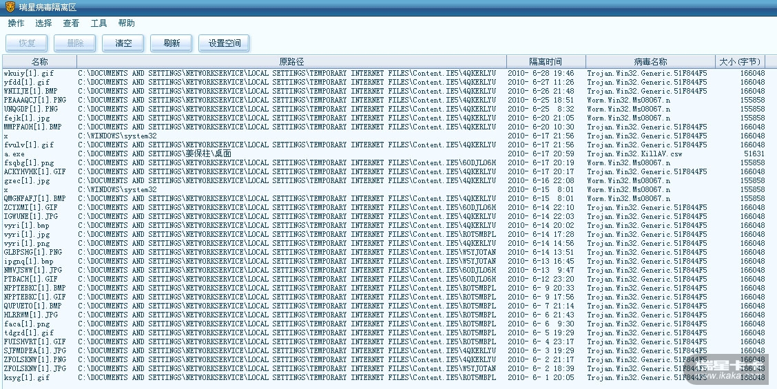 还有一个病毒,瑞星在右下角经常提示查到这个病毒,但是在隔离区却从来看不到这个病毒的信息。这个病毒名称:Troian.Win32.Generic.11F844。每次查到的时候都是两个目录,一个C:\WINDOWS\SYSTEM32\X,另一个没记住。