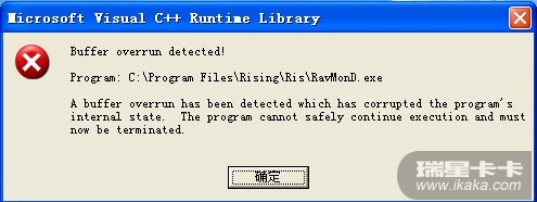 将系统里的杀毒软件完全卸载,卸载时不保留配置文件,手动将瑞星安装目录下的文件删除,将C:\Documents and Settings\All Users\Application Data\Rising\Ris(或rav)下的文件手动删除,网站下载新的安装程序,重新安装再升级后查杀观察。