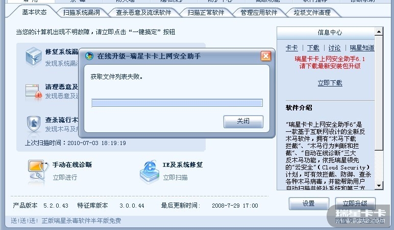 系统重做以后,卡卡助手一直是“获取文件列表失败”而无法升级,在网上查的都用过了,什么:请使用瑞星卡卡上网安全助手,'高级功能'中的'IE及系统修复',全选后,进行修复.若修复后仍无法升级,请尝试重新安装您的瑞星卡卡上网安全助手。我把系统都重新做过了也没用啊~~不知道有朋友遇到和我一样的问题吗?????