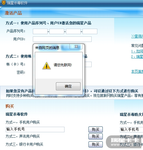 都试过了 IE能够上网 杀软里面连接测试也是通过的 但是就是激活不了 一激活就提示请您先联网 瑞星在这些小细节上处理的太让人失望了