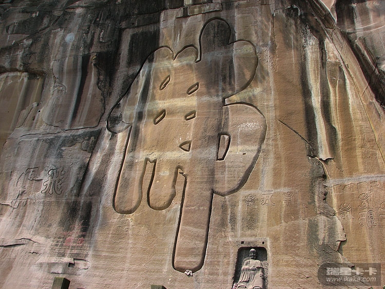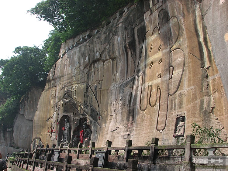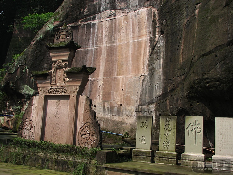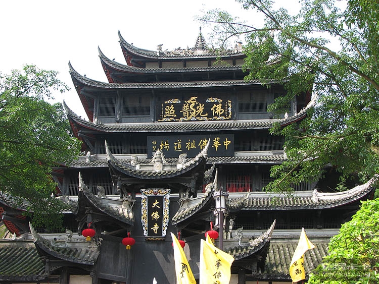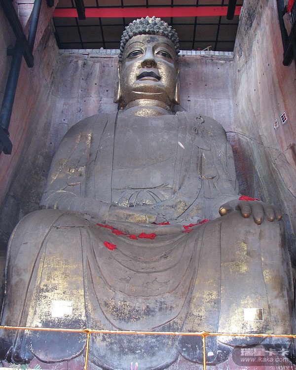 寺创于唐咸通年间(860-873年),初名“定名院”,又名“南禅寺”。后因宋朝在寺内依山凿一大佛,改称“大佛寺”。明朝在大雕像之上覆盖七重飞阁以蔽风雨,今尚完好,寺内古壁上存有历代名人题咏,其中飞霞、天开图画等,颇有艺术价值。该寺现在尚存大佛殿、观音殿、玉皇殿等木结构建筑,多系清末遗物。其中大佛殿堪称壮观,殿高33米,依山傍水,高阁飞檐,结构独特。殿内存释迦牟尼坐像一尊,周身贴金,金光灿灿。像高18.43米,胸围8.35米,结跏趺坐,头系螺髻,袒胸,套双领外衣,左手置于膝间,右手平胸,施无畏印,形态庄严肃穆,双目炯炯传神,气势尤为雄伟。