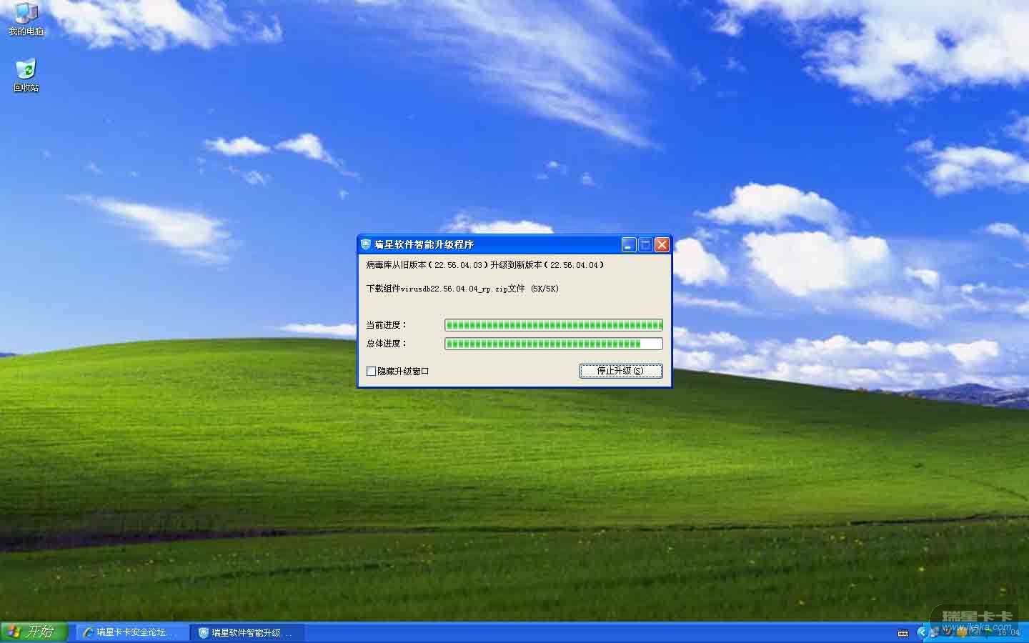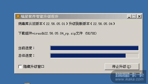 瑞星同一时间升级人多的时候据说会卡,但这总是暂时的,可以点隐藏或者等段时间再升级。