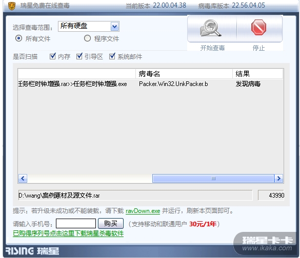 另外,查出来的这个病毒问题不大,其实就是你的这个程序被加壳了而已,把瑞星的主动防御全开,即使有毒也应该可以防住的。不过在来源不可靠的情况下最好别打开。