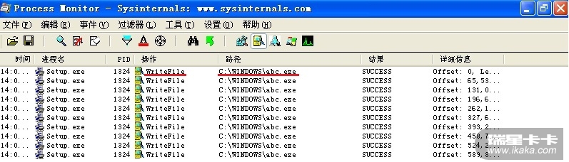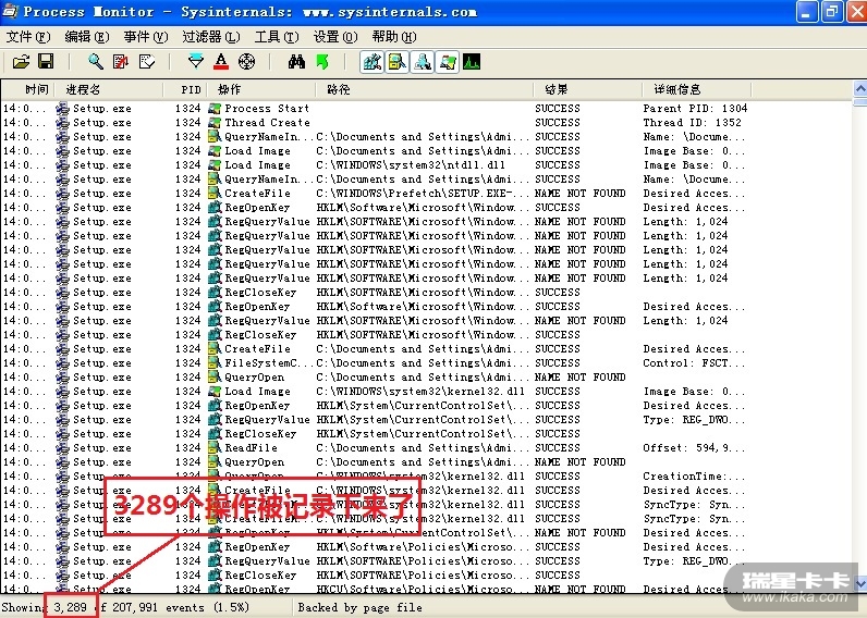 双击setup.exe,ProcessMonitor里面记录了许多行为,共有3000+个,所以我们还要继续筛选。