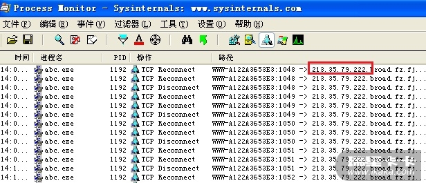 如图中,总共有两个进程被创建,一个是setup.exe,这个是病毒样本,另一个是abc.exe,这个是释放的病毒体。如果出现了其他程序,就要考虑是不是木马下载了其他木马病毒程序。