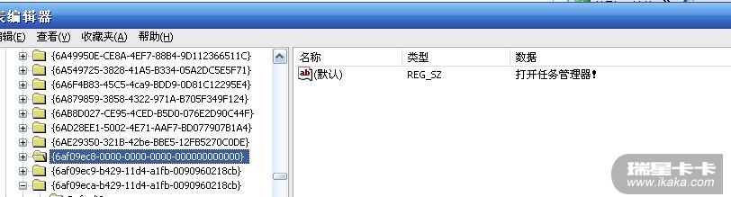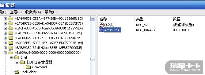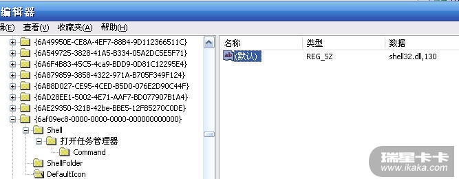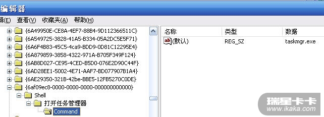 在这个CLSID下再新建一个子项,项名为Shell,再在Shell下面再创建一个子项,项名为菜单的名称,再在这个项下面键一个名为Command的子项,然后将右边的“默认”一键的键值设为taskmgr.exe。