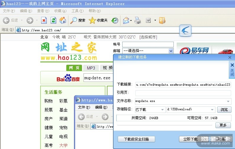 三。病毒跟踪日志:今天又发现一个新情况由杀毒软件拦截的一个病毒名为mupdate.exe 此文件寄生在360safe\safemon\mupdate.exe 中 我只要初次点开IE 首页为hao123 在里面百度搜索 点击搜索便会自动转到下载 启动迅雷 和系统自带的下载器 下载243K文件!