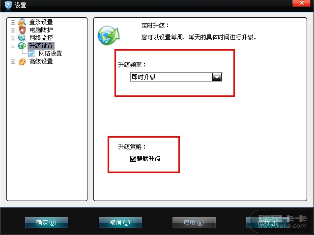 如机器无明显异常,可以设置为【即时升级】并设置【静默升级】,就可以了。正常情况下,瑞星不会弹出升级对话框。如果不出现系统明显放慢等现象,用户是感觉不到瑞星在升级的。