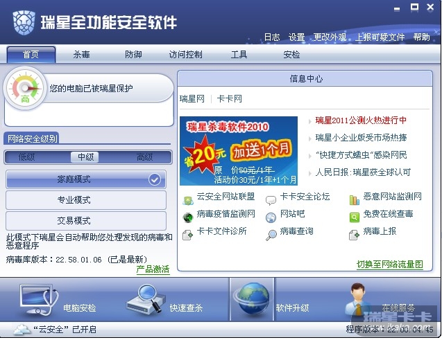 可能是瑞星受损了,修复下看看.打开开始->程序->瑞星->修复