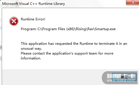 瑞星2010杀毒软件 22.00.04.43(病毒库22.58.00.00) 经常弹出smartup.exe runtime error