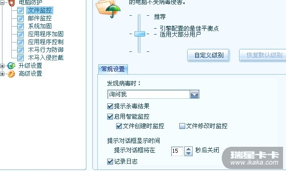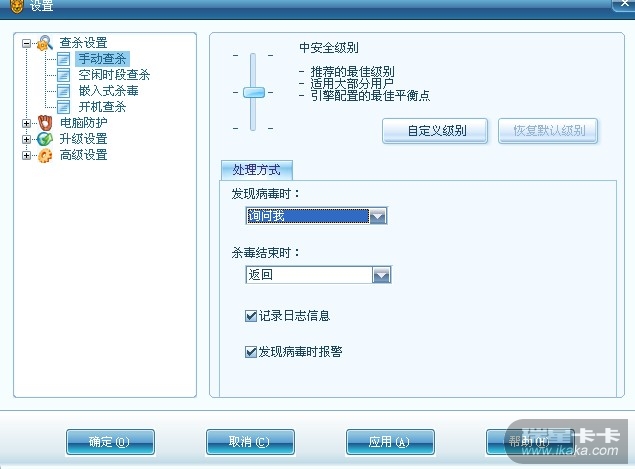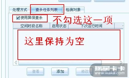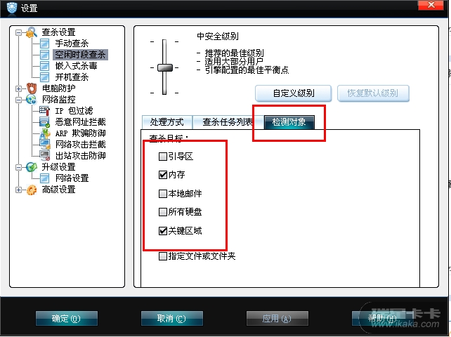 我看了你图中“空闲时段查杀”里对“检测对象”的选择,都是很笼统的“内存”、“引导区”的选项。如果选择不查杀“内存”等目标,很可能给真正的病毒可趁之机。