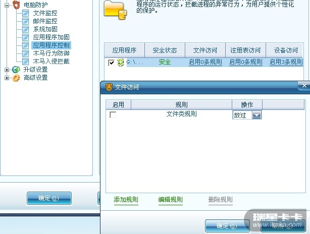 我需要的是打开所有瑞星的监控(这样可以保护电脑不受真正病毒的侵犯),并且定时还要自动杀毒,但又不妨碍我自己设置在电脑上的服务程序运行(该程序被瑞星病毒库列为病毒)。这就需要杀毒软件的白名单来配合了!