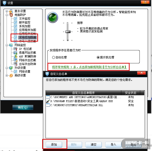 我感觉和“木马行为防御”无关!因为都是我的电脑,所以我是在关闭瑞星防护的状态下安装的服务端程序。安装完毕,再添加的白名单。恢复所有实时监控。