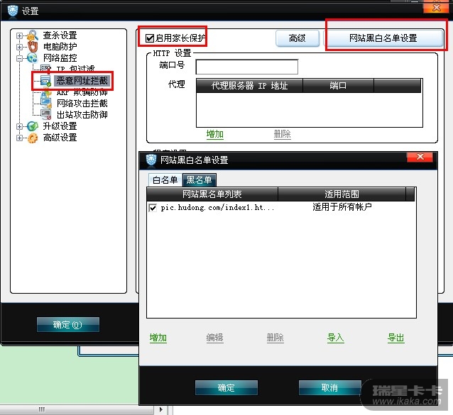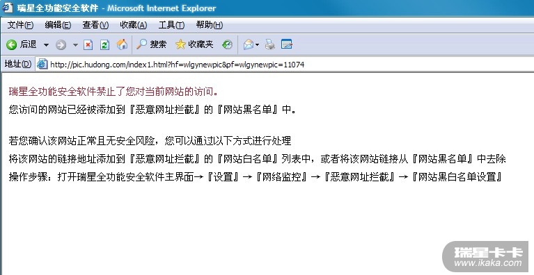 楼主打开瑞星防火墙或者瑞星全功能安全软件主界面,在『网络监控』→『恶意网址拦截』→『网站黑白名单设置』中将该网址加入黑名单。