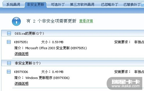 杀软安检提示的漏洞结果=卡卡中的"系统漏洞"+"非安全更新"+"可选补丁"+"第三方软件漏洞"+"已忽略补丁"