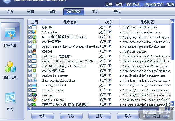 先用瑞星全功能软件全盘扫描一下确认无毒,再将改程序加入白名单:打开瑞星全功能软件-访问控制-添加