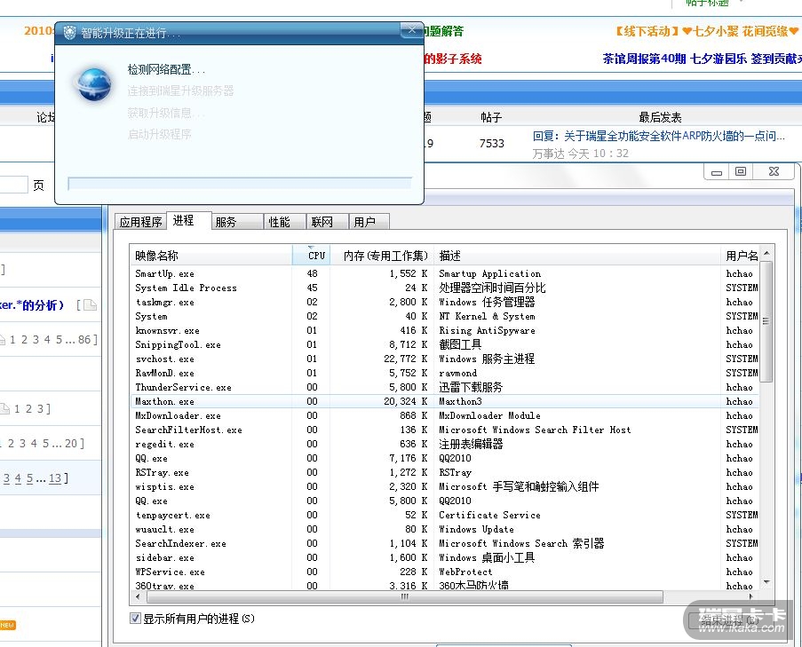因为家里电压低,电脑不正常关机,造成瑞星升级文件损坏。卸载后重新安装(原先的文件已经全部删除了),但是不能升级了。老是停留在“检测网络配置”窗口。