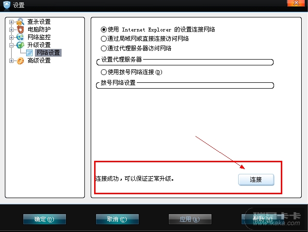 打开杀毒软件主程序,选择设置-网络设置,按照自己的上网方式选择,使用宽带和局域网用户选择第一、二项即可,通过代理服务器可以选择通过代理服务器项,楼主看看上网方式选择是否有误,同时希望跟帖显示截图,看看无法连接网络的错误代码
