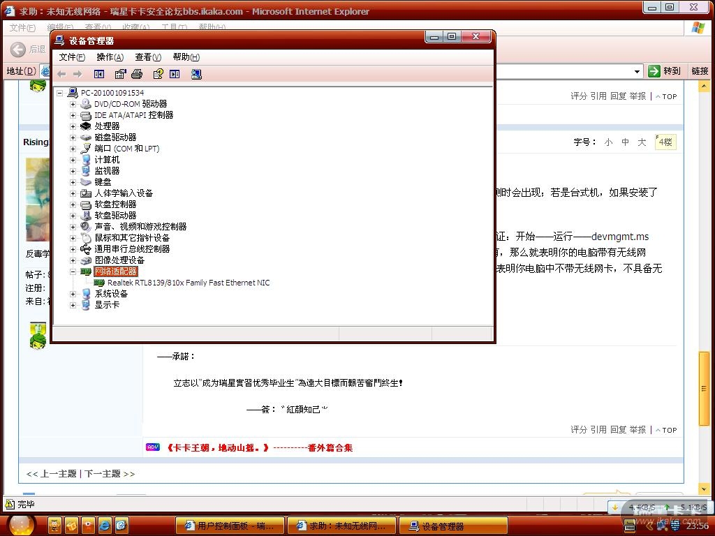至于你的电脑上(如果是台式机)是否存在无线网卡,你可以按照以下方法验证:开始——运行——devmgmt.msc,打开设备管理器,在网络适配器项中查看是否有“无线”字眼的名称,如果有,那么就表明你的电脑带有无线网卡。(注:笔记本基本上都带有,所以此步骤也可以忽略);如果没有,那么表明你电脑中不带无线网卡,不具备无线上网功能,在intel官网上检测显示未知设备或不受支持的设备是属于正常的。
