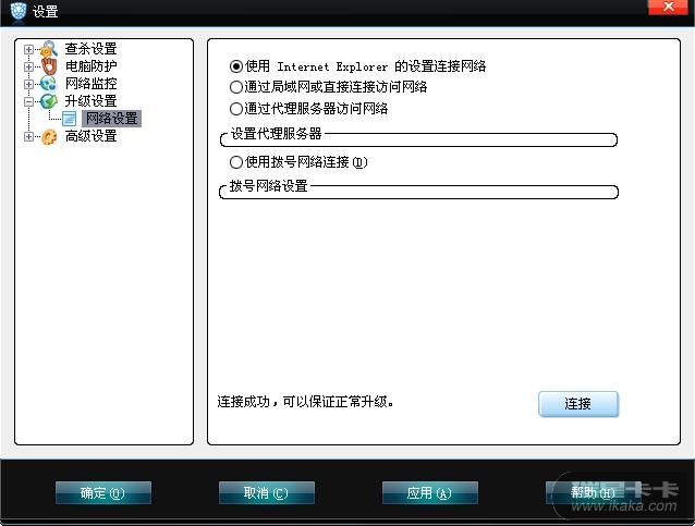 2.打开杀毒软件主程序,选择设置-网络设置,按照自己的上网方式选择,使用宽带和局域网用户选择第一二项即可,通过代理服务器可以选择通过代理服务器项。