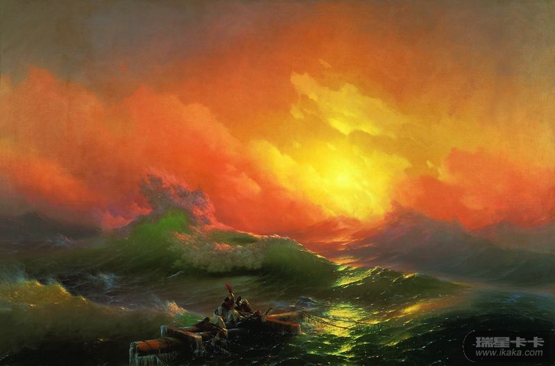 伊凡·艾瓦佐夫斯基是一位俄罗斯亚美尼亚画家,他居住和生活在克里米亚,以海景画著名,此类画作占其作品大半部分。他的描绘波涛和海浪的光线的技术和想象力尤其令人钦佩,使他的作品非常浪漫并具备现实主义,尤其是他在几乎透明的层次上描绘不同的日光和月光的能力,有时从云后射出,有时从雾中射出。他也画风景画,包括乌克兰农民生活的场景和君士坦丁堡的城市生活。图为艾瓦佐夫斯基作品《第九波涛》。