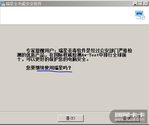 要卸载瑞星,那个“专家建议瑞星。。。。”的对话框应该选否:kaka6: ,才能真正把瑞星卸载