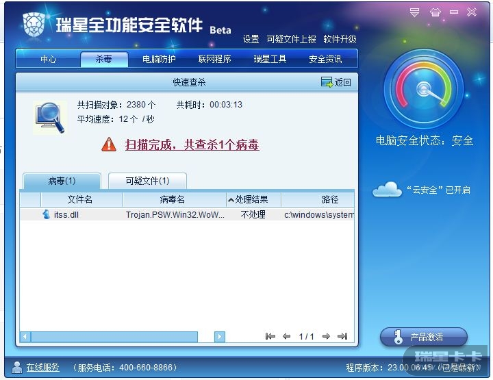 先升级下瑞星病毒库,然后再查杀看看.也有可能是病毒库已满,先清理或扩充下后再查杀试试.你可将这文件从病毒隔离区恢复出来并打包,到