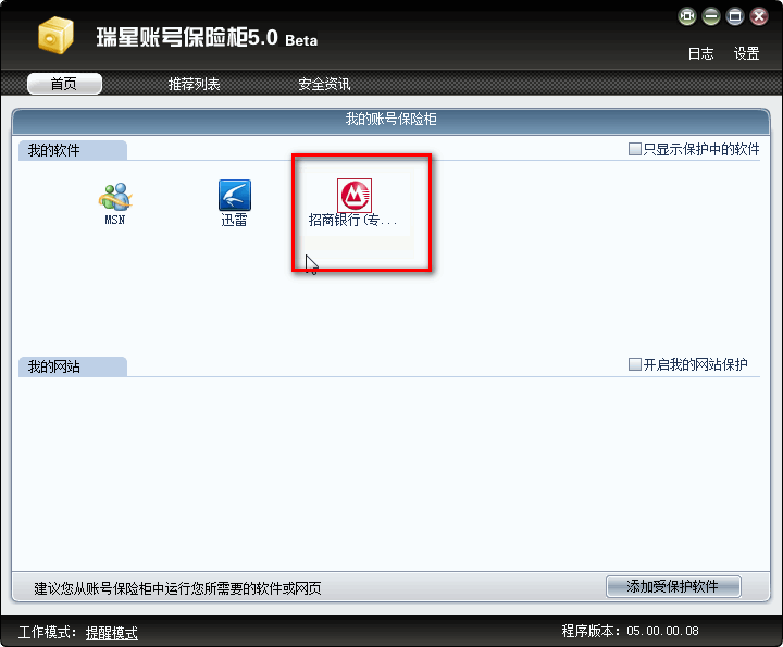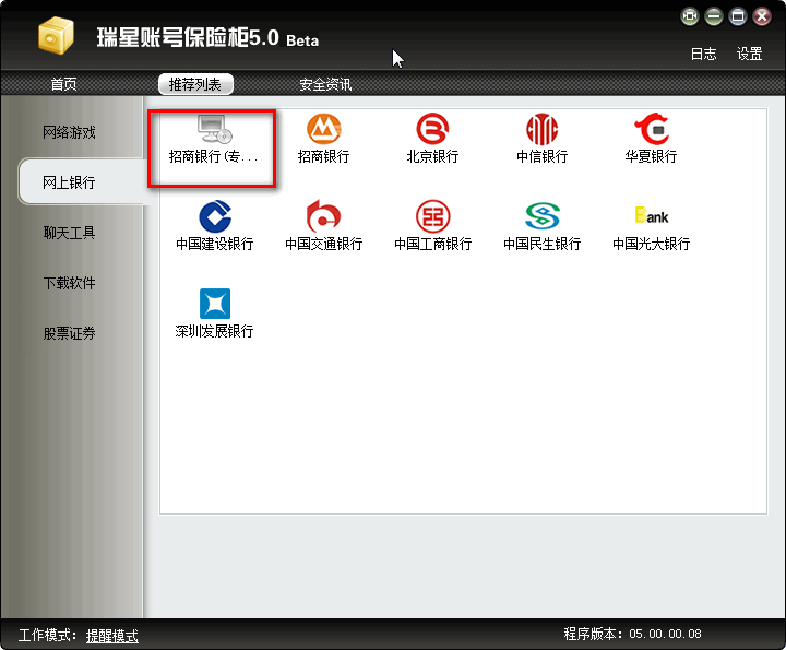 问题描述:自动搜索的能发现,主界面显示有。网银列表中招行网银专业版为灰色,但主界面中是彩色