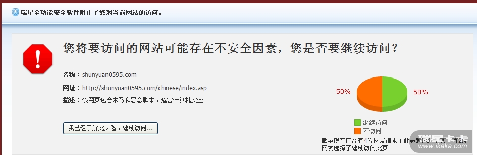 版主,我说的是点击继续浏览,瑞星的木马入侵拦截,没有提示,而360的网盾提示拦截到网马!