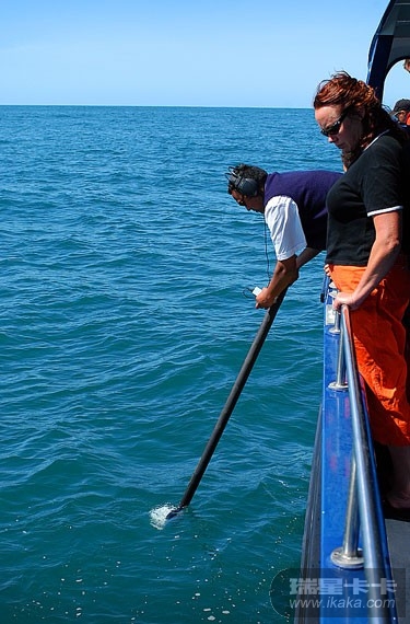 船長在航行途中不斷以無線電跟其他賞鯨船或賞鯨直昇機互通鯨魚出沒的訊息,也不時的看到船長帶著耳機在船邊利用聲納等探測儀器來探索魚群位置。