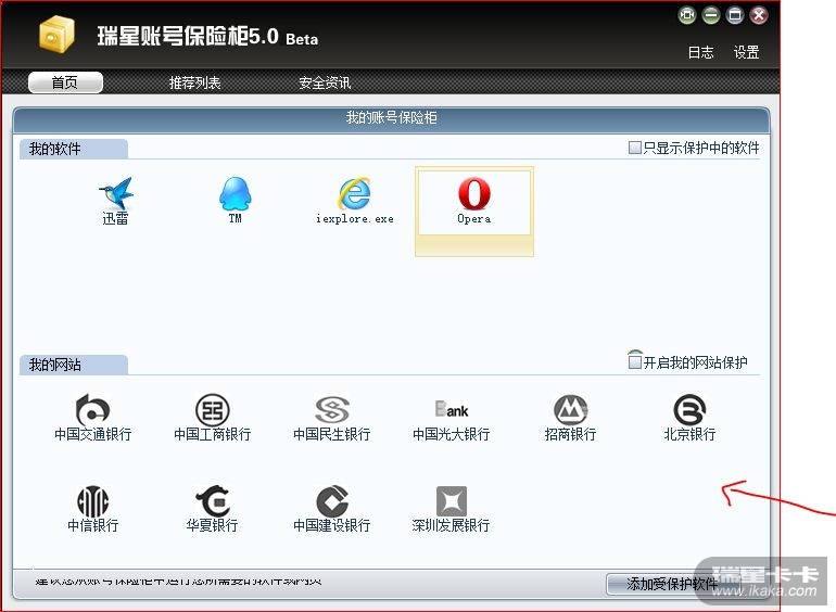 发现“开启我的网站保护”无法开启(昨天就无法开启一直到刚刚),于是就麻烦了,下面一排银行列表全部是灰色的,但是第一个“中国交通银行”点击之后却显示“受到保护”~其余的全都显示“不在保护中” (另外,打开交通银行后跳出一个网页时,保险箱提示“IE已退出”,速度太快,没截到图,明明是开启,怎么提示是退出呢? opera下同样如此,而且经常提示阻止opera读取内存,有点麻烦~)