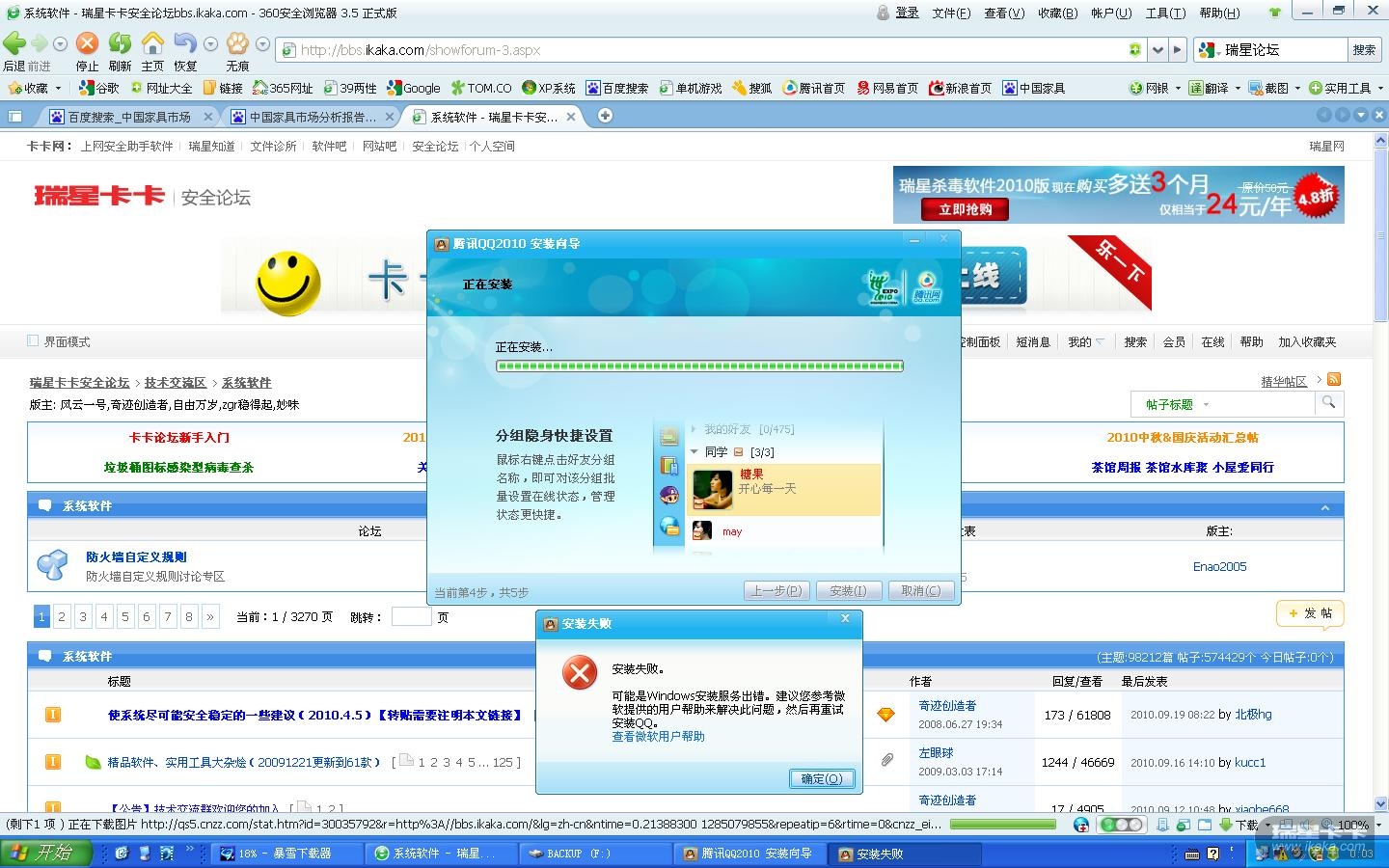 开始--运行--输入regsvr32 msi.dll--回车,如果显示“msi.dll已成功注册”的信息,则再重新安装QQ应该就不会失败了。