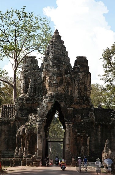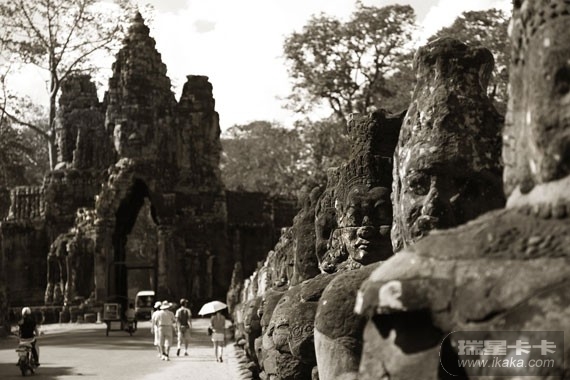 現在,她就矗立在我眼前,用那種令人感到偉大、不可侵犯的姿態矗立著,陽光從側面斜削過城牆頂端的佛像,像是刻意為了營造它的威武與莊嚴而製造的光線,進大吳哥城之前要先經過護城河上的石板橋,橋兩側刻劃的攪動乳海城雕像,這是一個很古老的印教創世神話故事,雕刻呈現的是最經典的一幕:毗濕奴化成靈龜頂著須彌山作支點,92個阿修羅(凸眼頭戴冠毛頭盔)拉著五頭巨蛇(Naga)的頭,88個善神(杏眼頭戴圓錐型頭飾)拉著巨蛇的尾,以輪流拔動巨蛇身體方式轉動須彌山一千年。