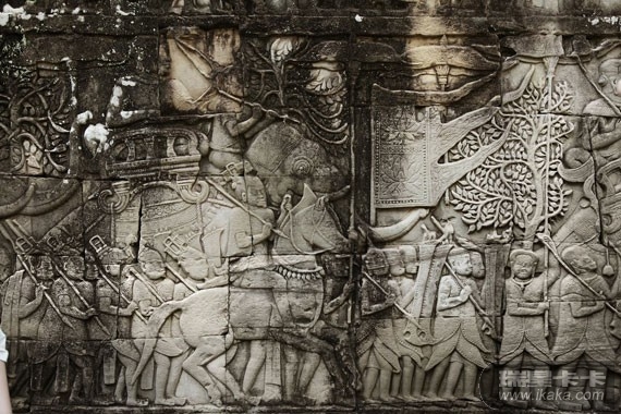 戰爭,從耶輸跋摩一世到將吳哥王朝治理得最輝煌的闍耶跋摩七世都在戰爭,壁上的雕刻最多的就是歌頌武功或記錄歷史的戰爭,記載庶民生活的雕塑反而非常少,因為統治者是人,戰爭是人類暴戾本質的產物,討伐征戰的血腥刻劃在代表神祉與宇宙中心的宏偉寺廟,是在宣揚天子的神威?還是昭告庶民王權神授的政治正確?