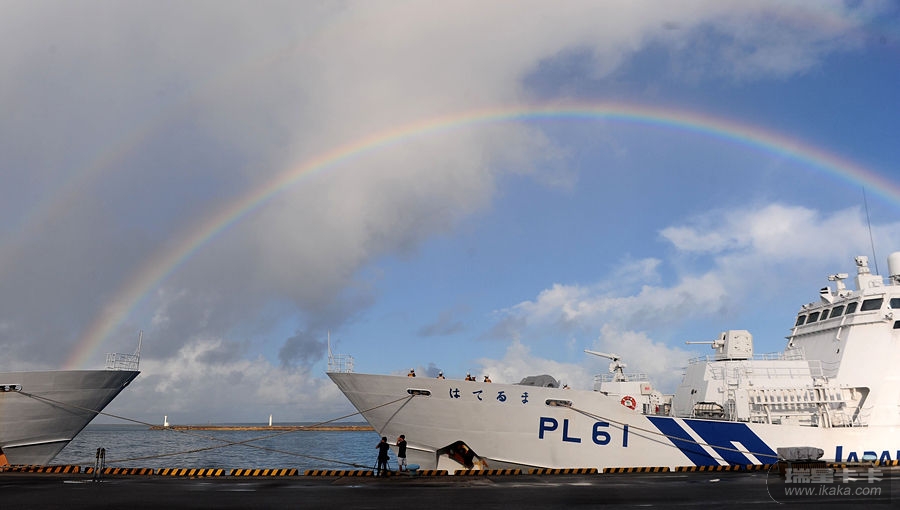 3、9月13日,在日本冲绳县石垣港停靠的我国渔船不远处天际出现彩虹。被日方扣押7天的中国渔船上的14名船员于当日乘坐包机回国。
