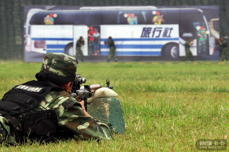 16、9月15日,武警战士在模拟演练中瞄准狙击车上的“劫匪”。当天武警四川总队现场还原菲律宾人质劫持事件,用狙击枪狙杀“劫匪”,六发子弹全部命中目标,用时不到一分钟,成功解救“人质”。该总队参谋随后表示菲律宾警察犯下很多低级失误,“入门课没过关”。