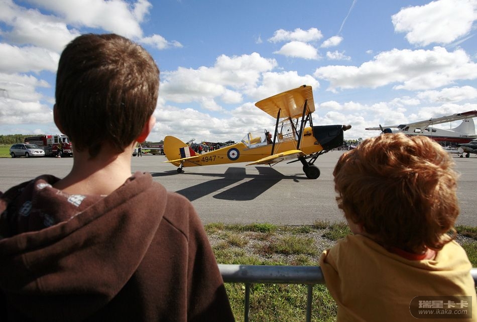 32、9月18日,在加拿大首都地区的加蒂诺-渥太华行政机场,两名孩子观看一架加拿大制造的虎蛾飞机起飞。当日,加拿大老式飞机飞行表演在这里举行,以此向第一次和第二次世界大战中的三位加拿大维多莉亚十字勋章获得者表达敬意。