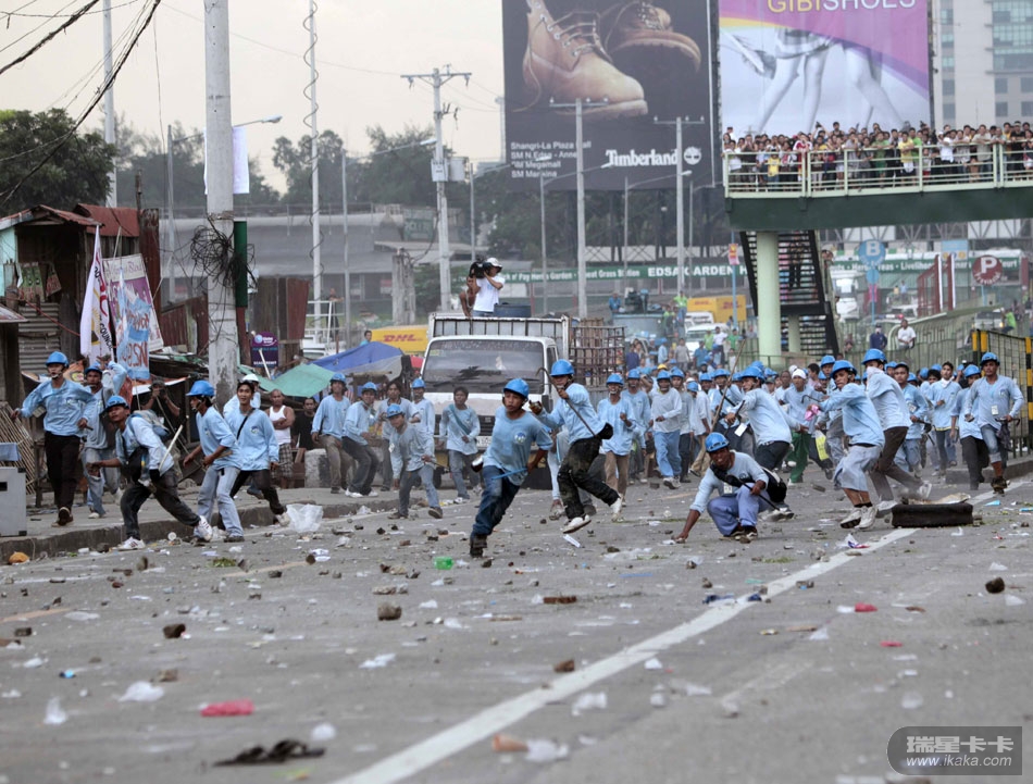 35、当地时间9月23日,菲律宾首都马尼拉卫星城市奎松爆发由暴力拆除贫民窟而引起的大型警民冲突。当天,数百名贫民窟居民朝政府拆迁小组扔掷石块和瓦砾,最终拆迁小组寡不敌众,败下阵来。图为拆迁小组在朝贫民窟的定居者扔石头。