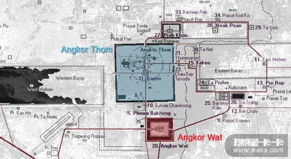 空照圖上大的正方形是吳哥城(大吳哥),小正方形是吳哥寺(小吳哥),這兩個是吳哥窟的核心,其他散布在外的廟宇與古蹟不計其數,大的正方形北方還有一個小小正方形,範圍比又小吳哥小很多,但是也擁有護城河,形式上完整這就是Preah Khan,Preah Khan 的意思是 聖-Preah 劍-Khan,字義上是寶劍的意思,故有人翻譯成寶劍塔,也有人音譯成普利坎寺。