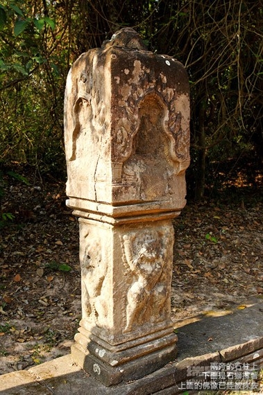 又走進了一點.....東門越來越近,兩旁的石柱上,下面是石獅撐著,上面的佛像已經被後世的婆羅門教或是印度教抹去。吳哥的國王不是信仰印度的婆羅門教就是大乘佛教,興建這廟宇的闍耶跋摩七世(Jayavarman VII)是信仰佛教的,但同時也包容其他宗教,所以剛剛蓋好時這是佛教為主與婆羅門教共有的廟宇,不過後來信仰上的改變,也使的佛像遭殃。