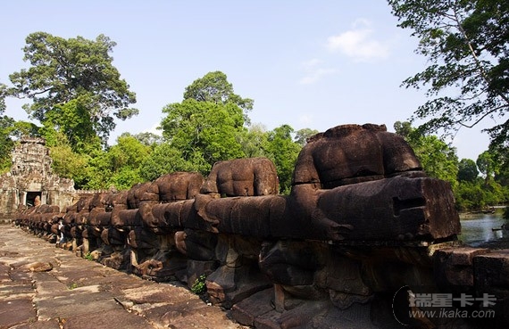 護城河石橋上"乳海翻騰",這是婆羅門教的神話故事,神像各置兩旁各自緊抓一蛇(或稱"龍")作拔河狀,分別代表『善』與『惡』,『創造』與『毀滅』,『光明』與『黑暗』,可惜神像的頭都損毀,龍身也都斷裂。