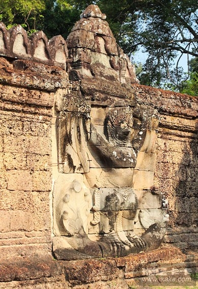 在東方來說,迦樓羅以人面鳥身、鳥面人身或全鳥身形象出現。在中國,迦樓羅結合了古代傳說中的大鵬形象,成為了佛祖的坐騎之一,是古代世界性的巨鳥崇拜的體現,有趣的是迦樓羅在印度或是中國總要抓著蛇(或龍);在這邊石牆上的迦樓羅(Garuda)舉起的雙手各抓著一條naga(龍),這邊說的龍外型跟我們常見的中國龍不同,有著眼鏡蛇的樣子,通常有五或是七個頭,naga龍其蛇的外貌是熱帶地區對眼鏡蛇崇拜的體現,naga在吳哥窟是無所不在,到處都看的到。